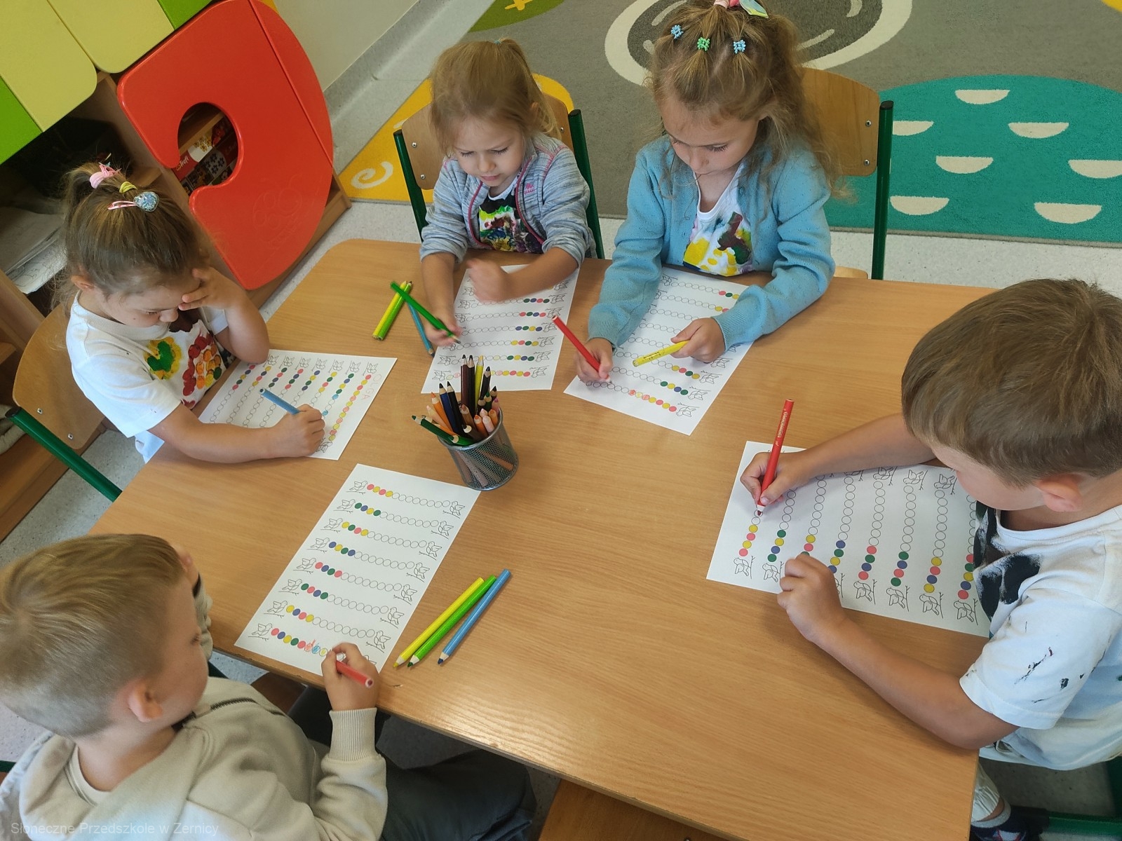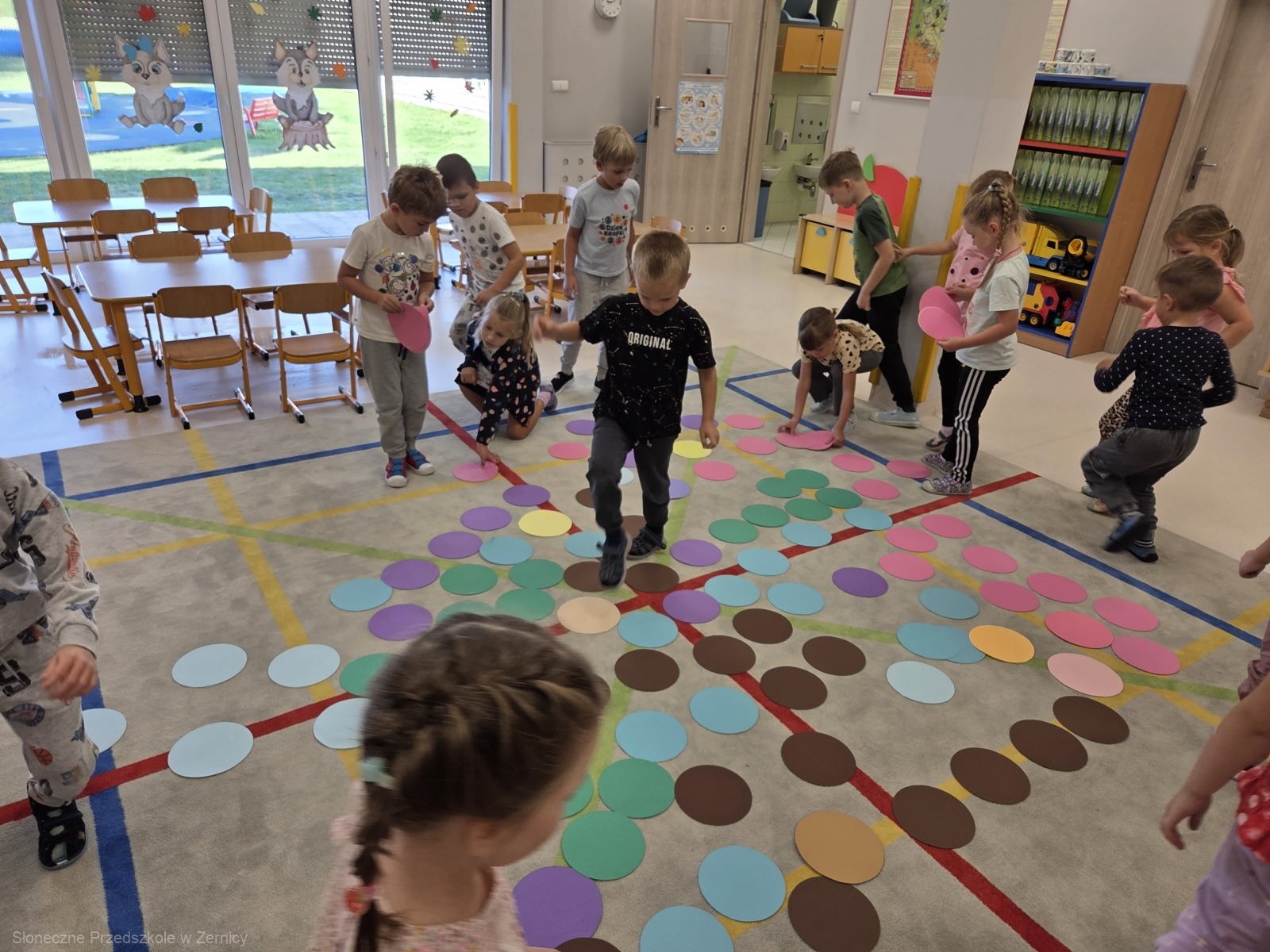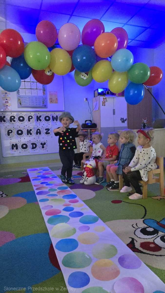Nie zabrakło również aktywności ruchowych, podczas których kropka stała się pretekstem do wspólnych gier, ćwiczeń i zadań wymagających współpracy oraz rozwijających sprawność i koordynację. Odbył się również kropkowy pokaz mody, gdzie dzieci prezentowały swoje stroje ozdobione kolorowymi kropkami. Dzięki tym aktywnościom, przedszkolaki mogły uczyć się współdziałania, a jednocześnie czerpać radość z ruchu i wspólnej zabawy.