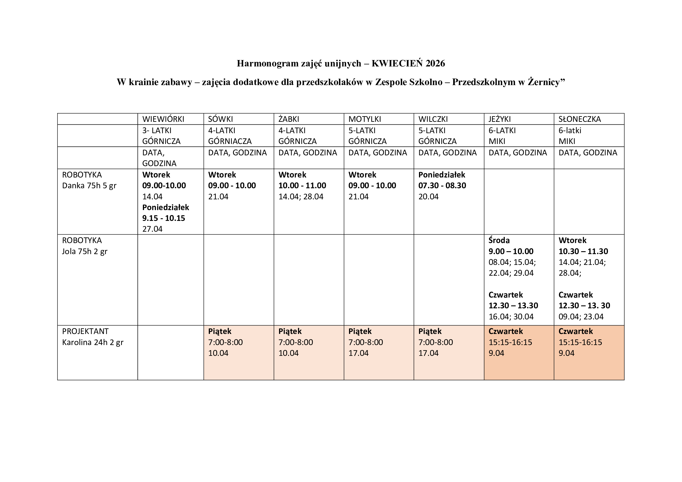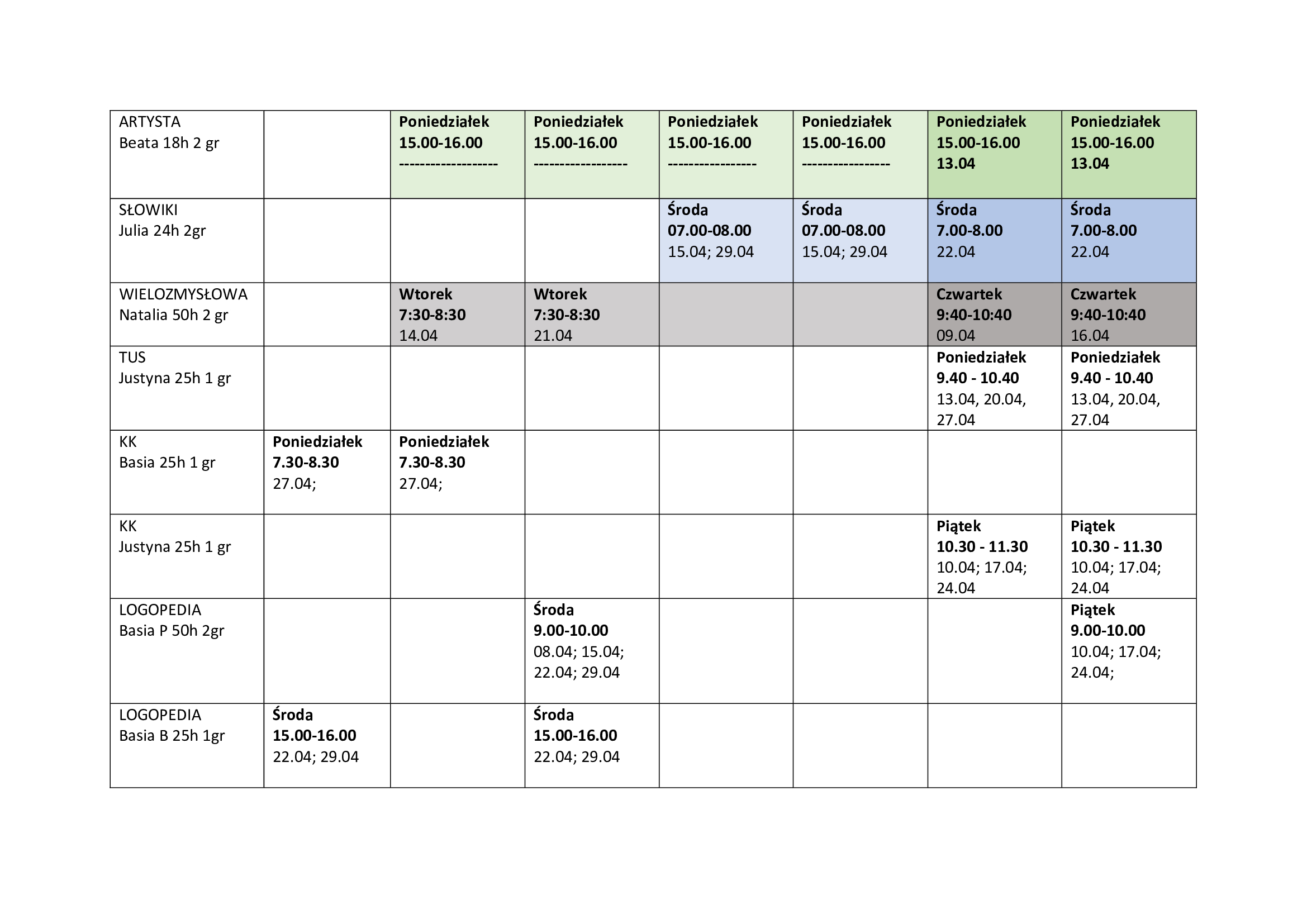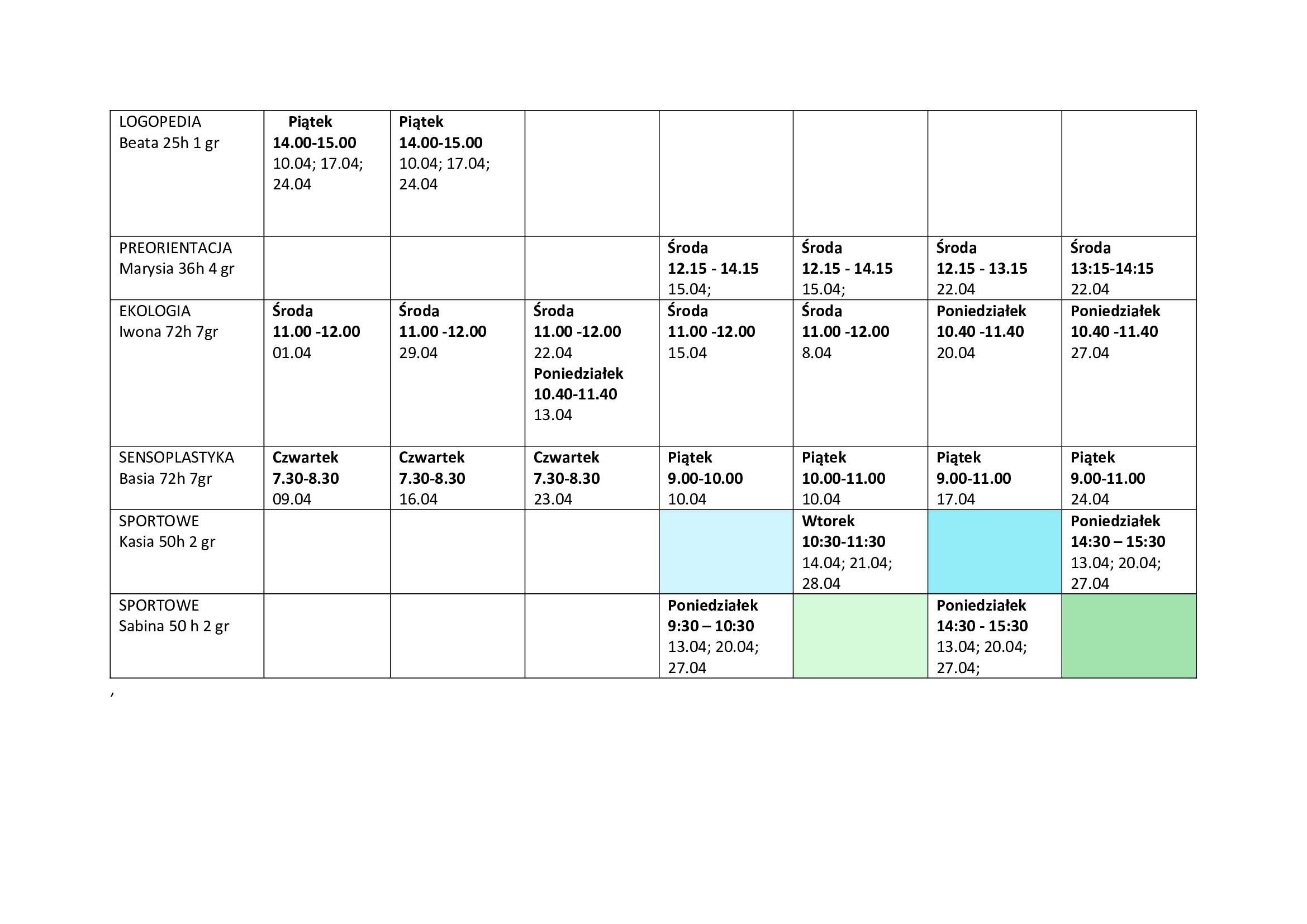 – 13.04, 14.04 – odwołane zajęcia sprawnościowo – zdrowotne w grupach Wilczki, Słoneczka;