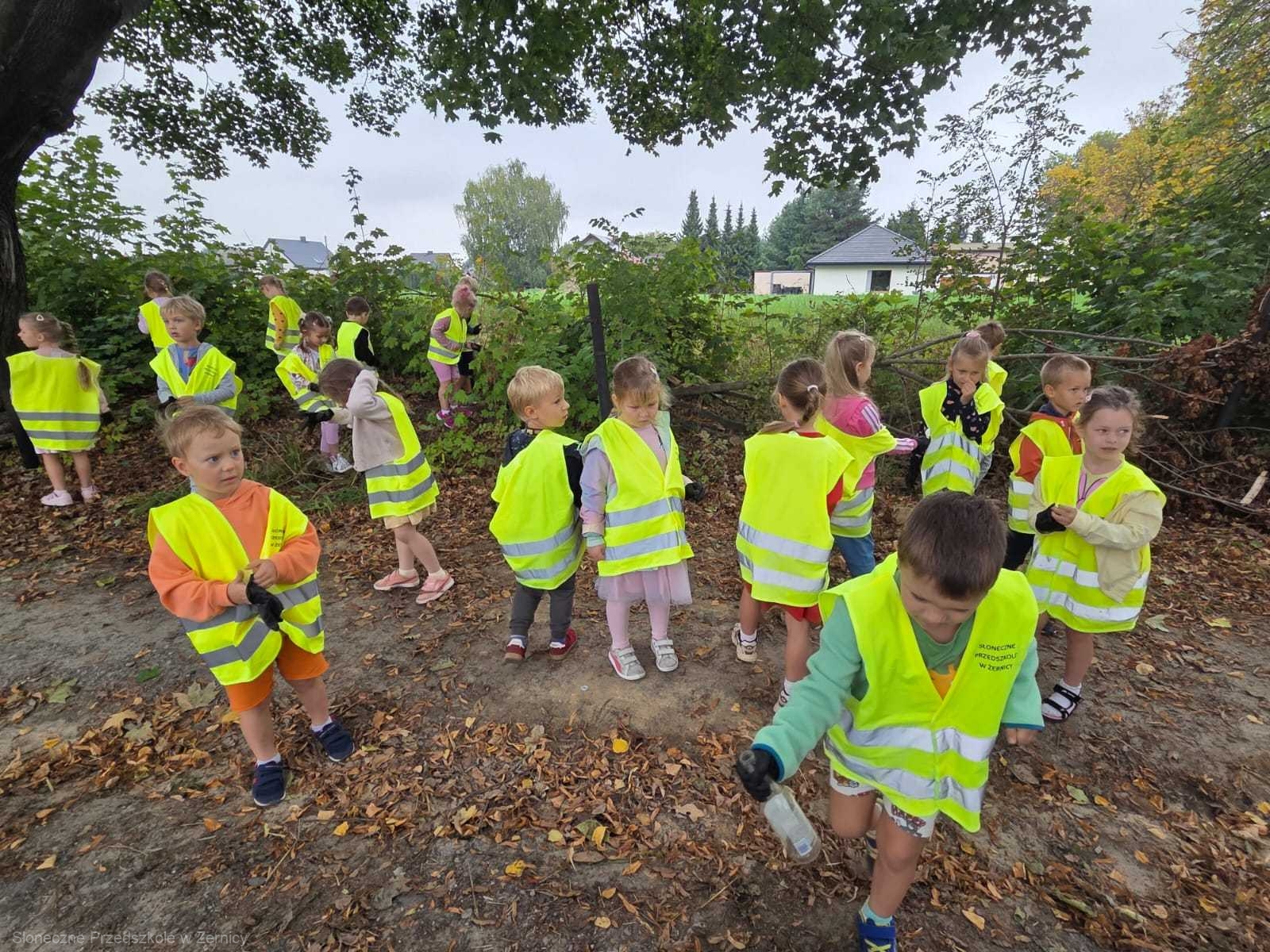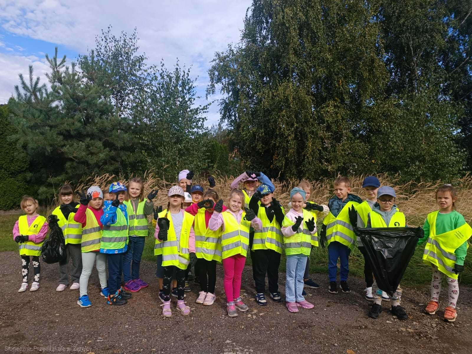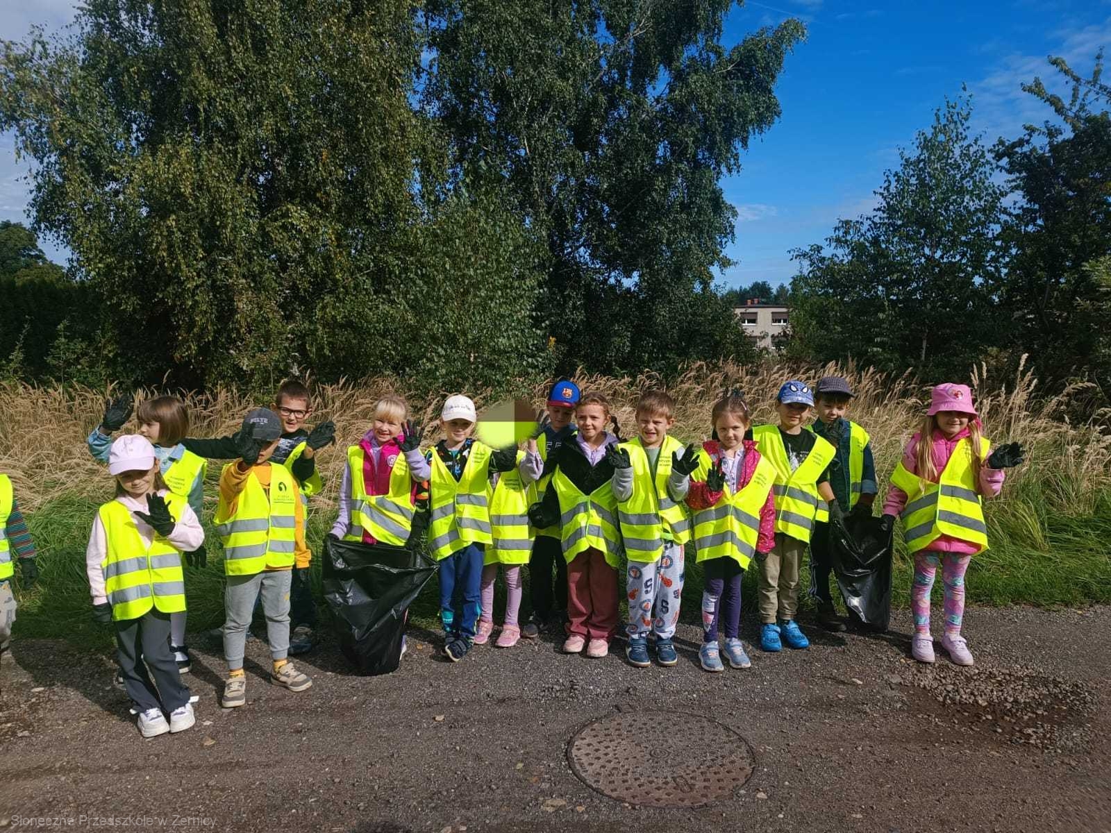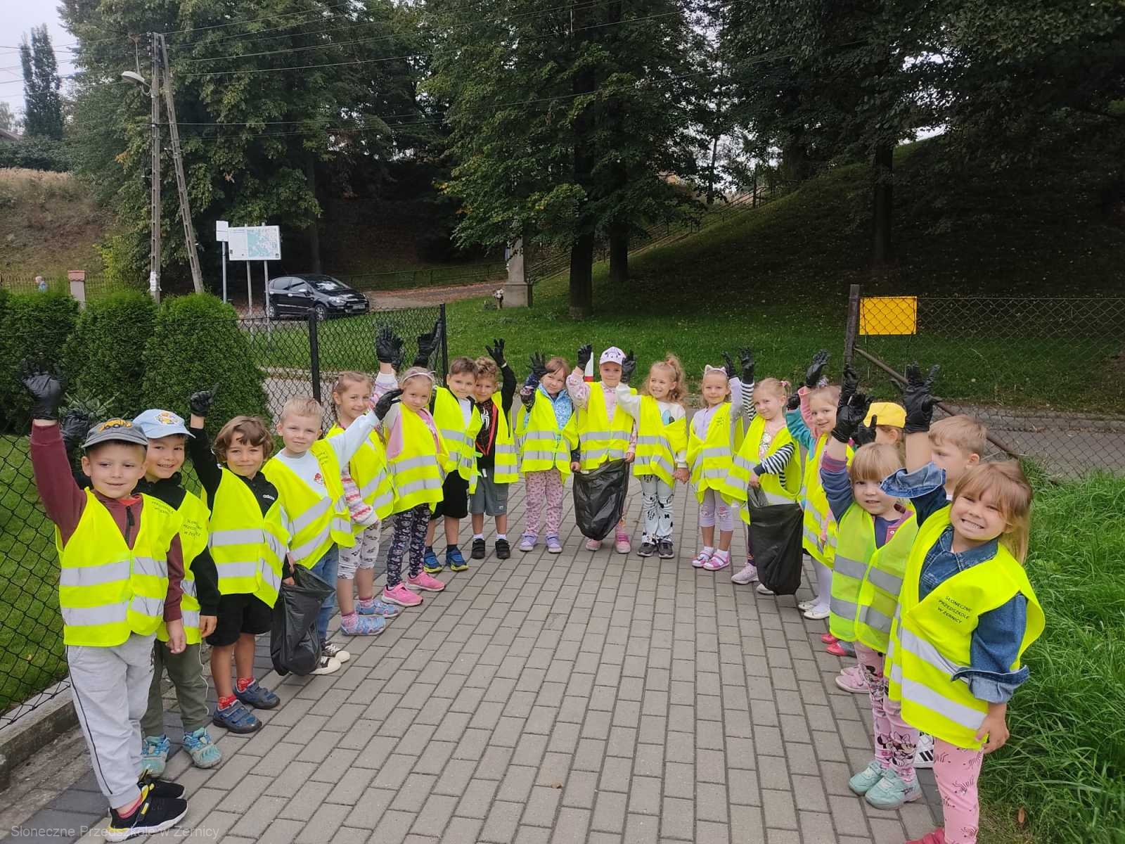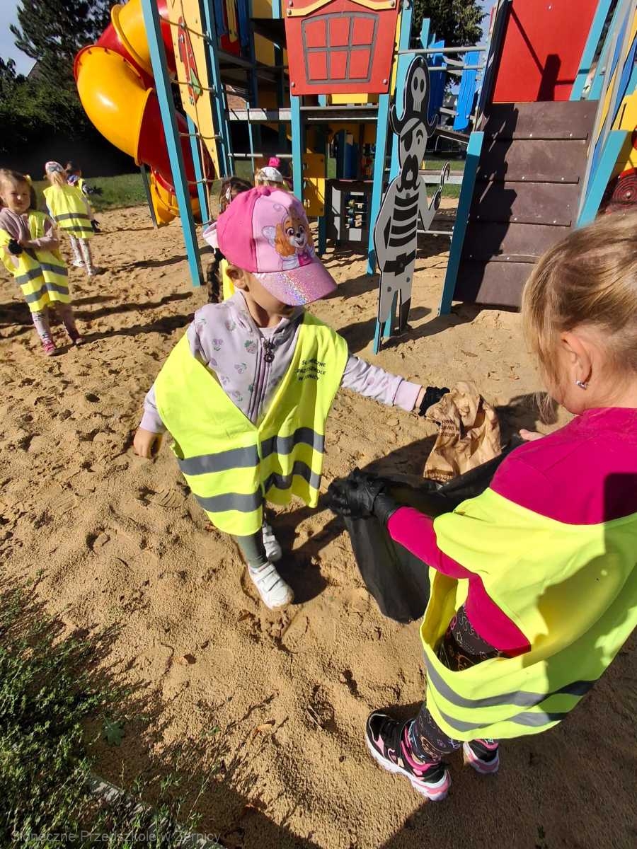 Przedszkolni pomocnicy zostali zaopatrzeni w rękawiczki i worki, do których zbierali śmieci.