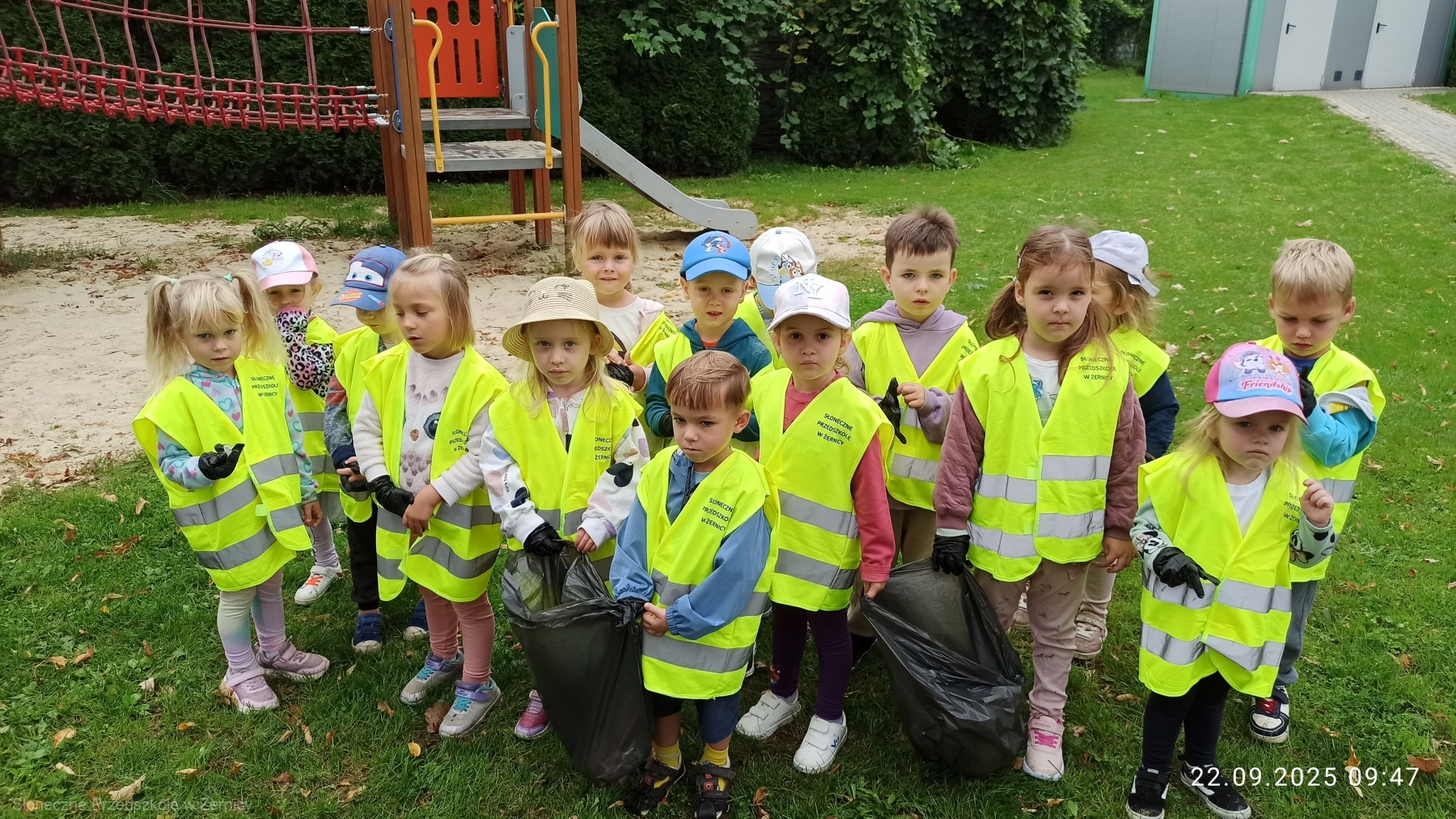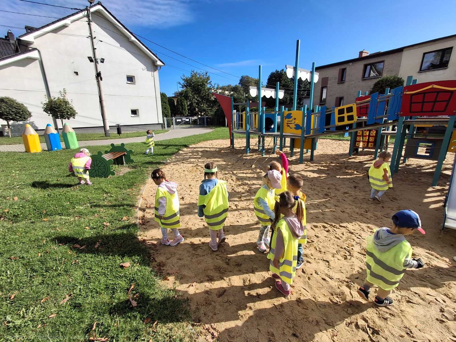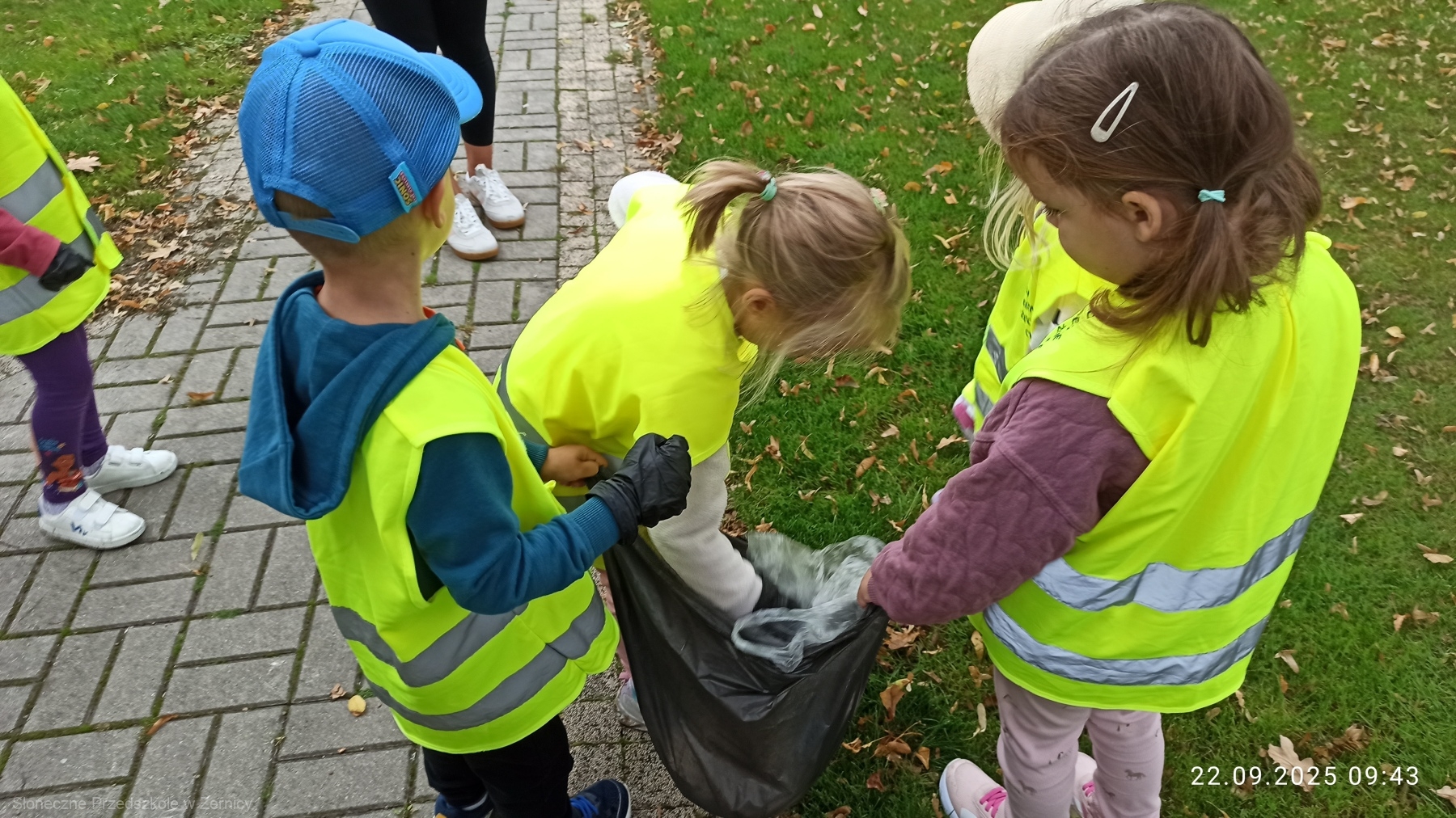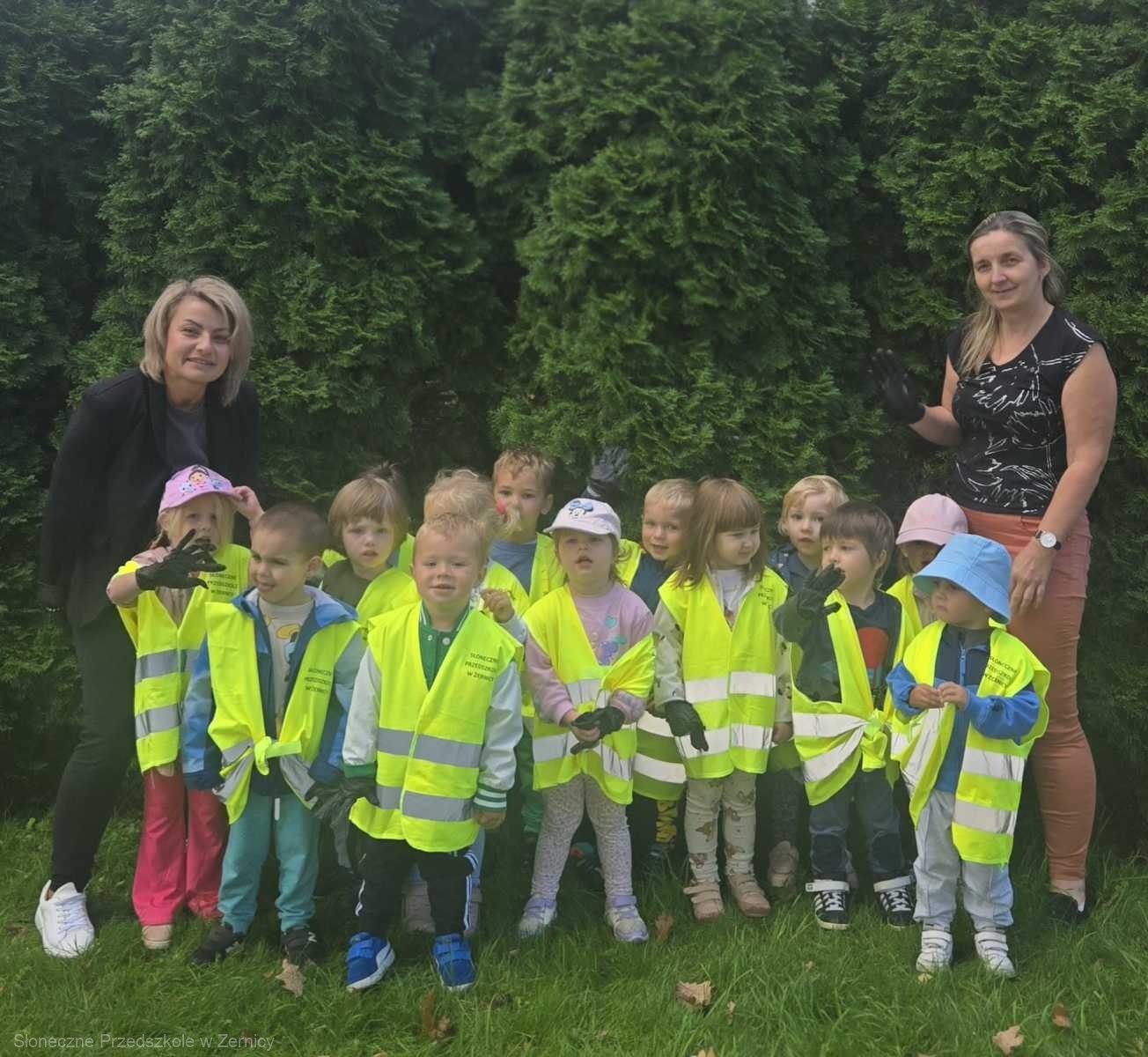 Przedszkolni pomocnicy zostali zaopatrzeni w rękawiczki i worki, do których zbierali śmieci.